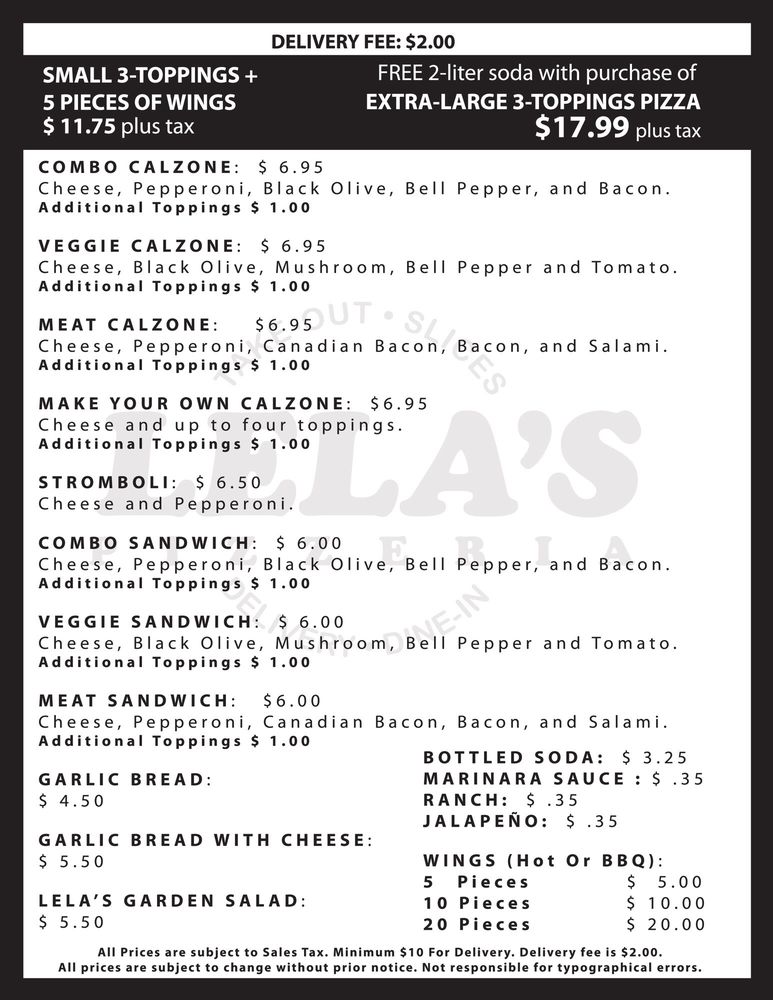 Whether you opt for takeout or enjoy the cozy atmosphere onsite, Lela's guarantees speedy service and a friendly experience. It's the perfect spot for family outings, group gatherings, or a quick bite. Don’t miss the chance to savor the essence of great pizza at Lela’s Pizzeria!